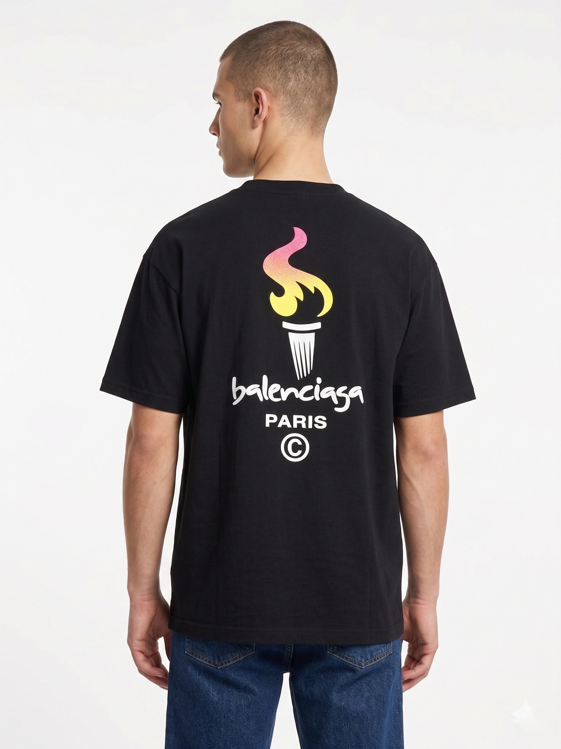 La vanguardia del lujo conceptual. Esta pieza de Balenciaga trasciende las tendencias para posicionarse como un ícono de la moda contemporánea. El diseño destaca por su gráfico de antorcha en el pecho, un símbolo de iluminación y poder, acompañado de la tipografía "Balenciaga Paris" en un estilo caligráfico que aporta un aire de autenticidad y desenfreno creativo.