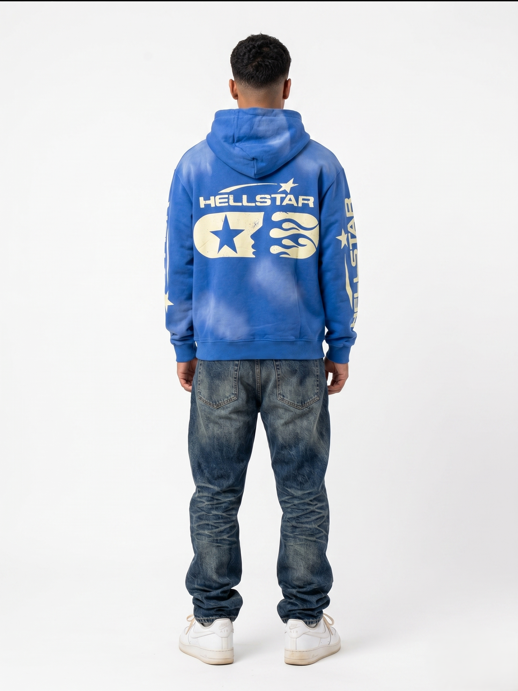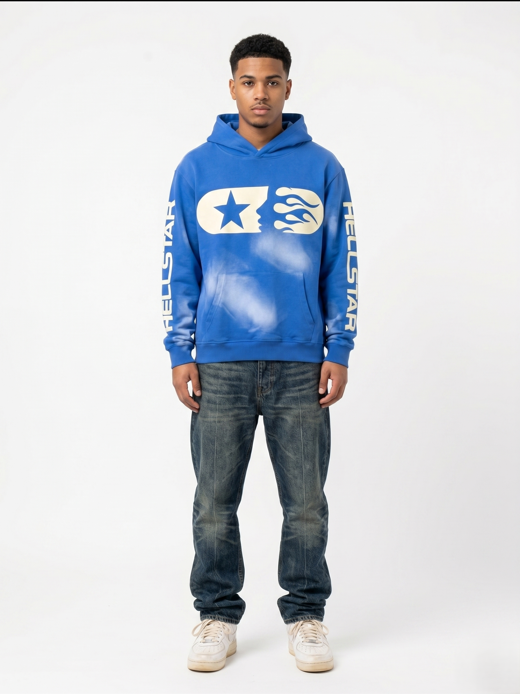 Haz una declaración de estilo audaz con este hoodie de Hellstar, una pieza que encapsula la esencia del streetwear experimental de Los Ángeles. Este modelo destaca por su vibrante color azul eléctrico, intervenido con un efecto de lavado "sun-faded" que crea texturas nebulosas en blanco, otorgando a cada prenda un carácter único y artesanal.