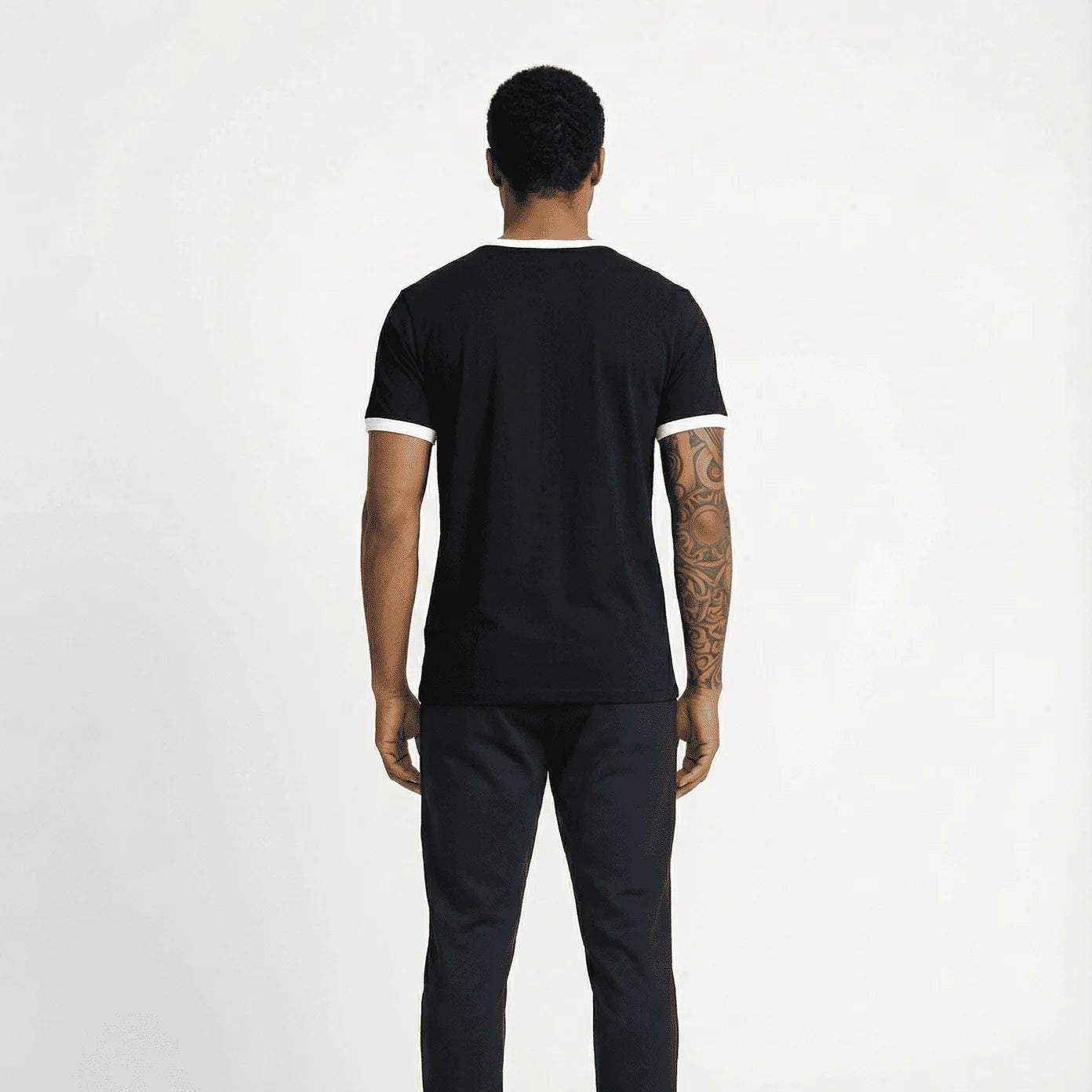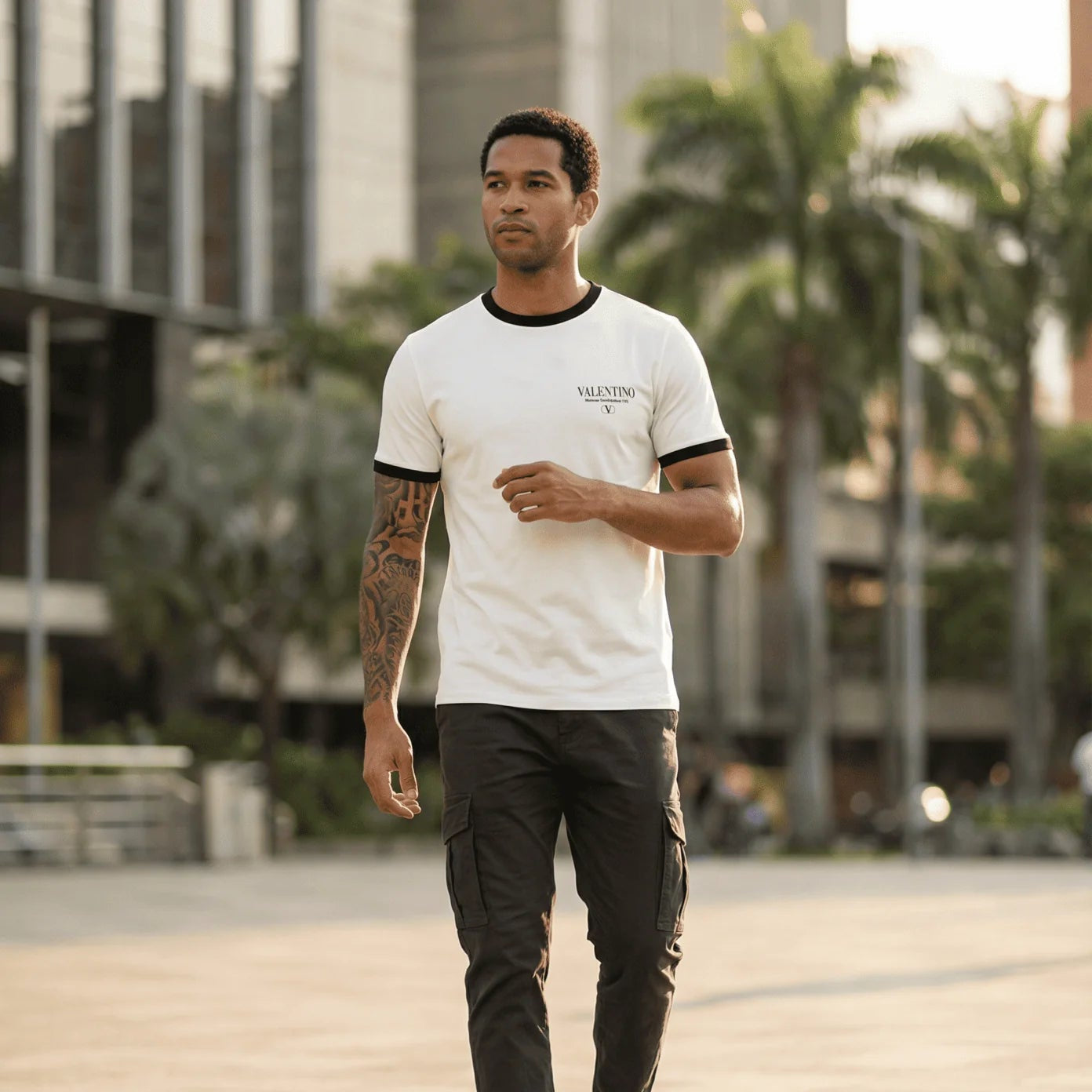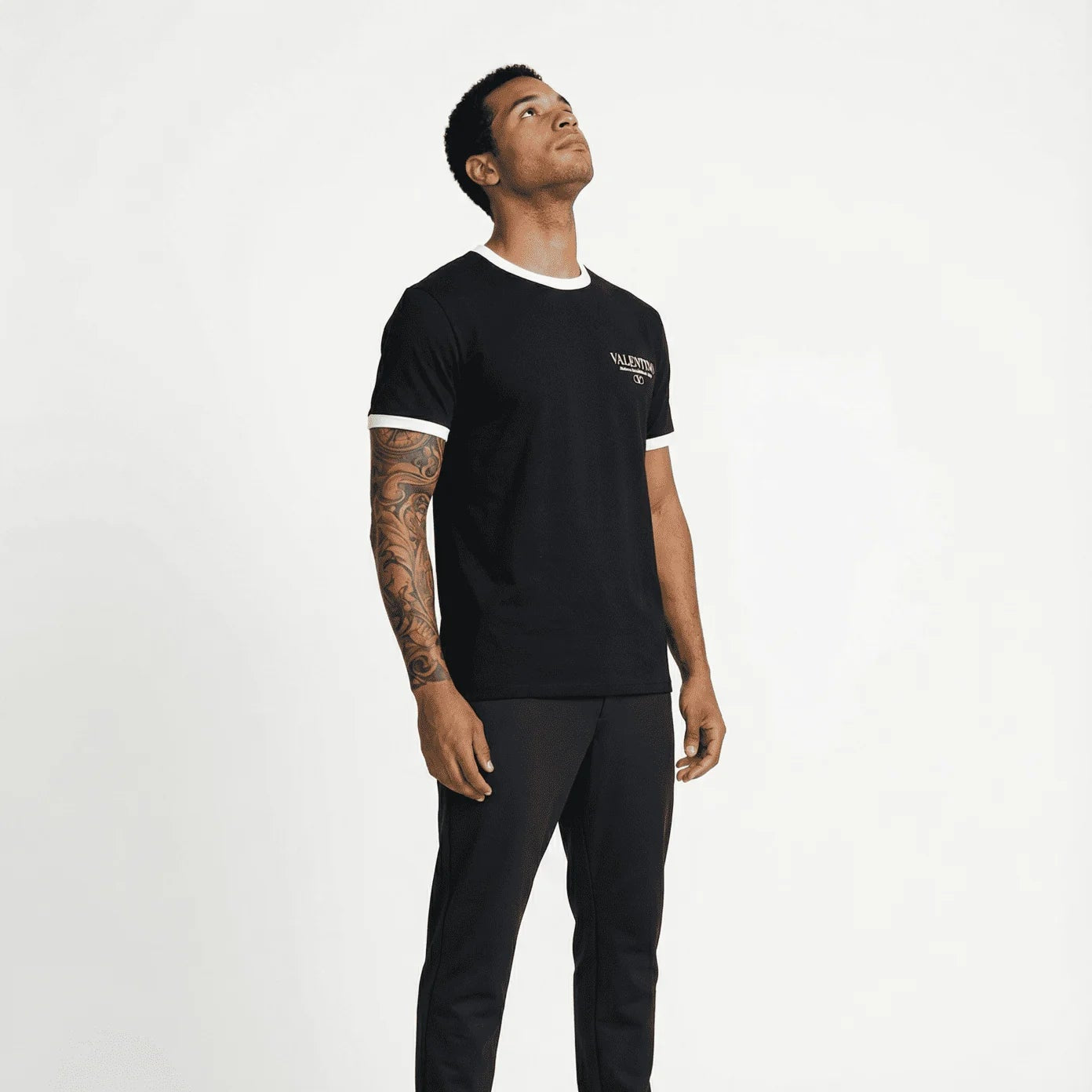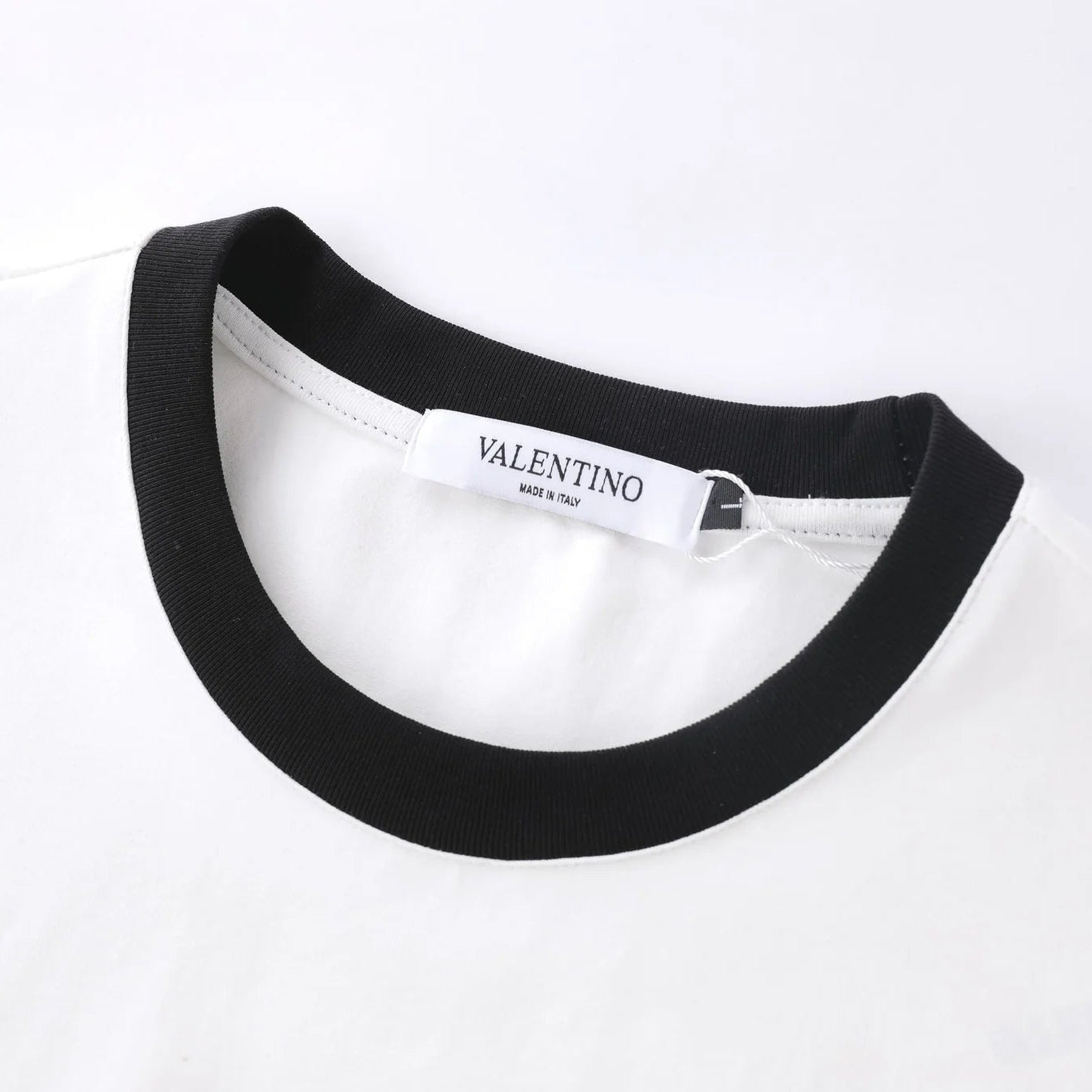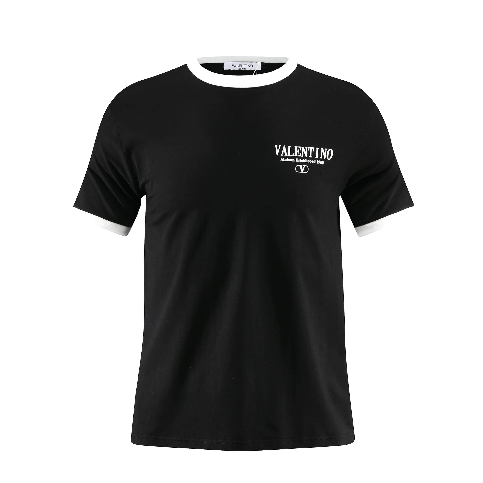 El distintivo cuello ringer y los ribetes en contraste en las mangas aportan un toque retro y deportivo, mientras que el elegante logo de Valentino en la parte posterior del cuello subraya la autenticidad y el lujo de la marca. Una pieza esencial para quienes aprecian la elegancia sin esfuerzo y la atención al detalle.